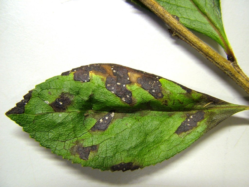 - Fungal fruiting bodies may just be visible within the leaf spot. These are most obvious as tiny black dots in the white centre of the spot