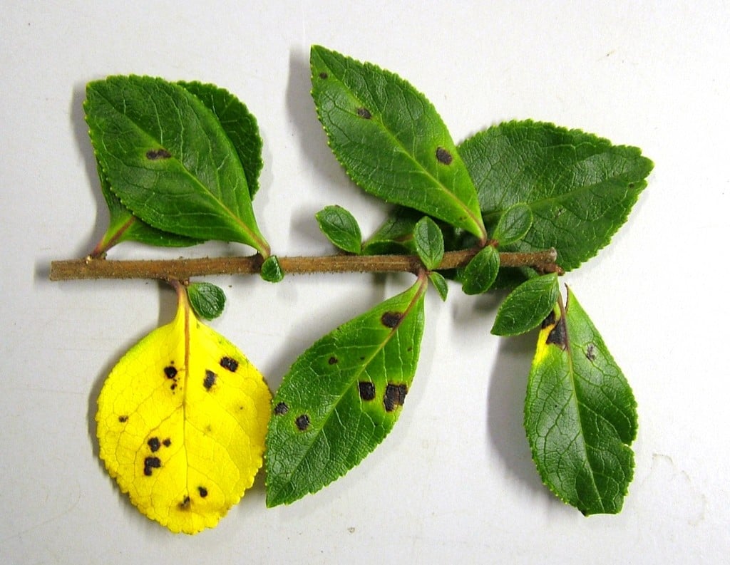 - Affected leaves turn yellow (starting around the spots) and fall from the plant