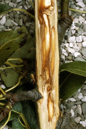 Under favourable conditions the infections spread rapidly down the inner bark at up to 5cm (2in) per day, staining the cambium a foxy reddish-brown colour. Severely attacked trees appear to have been scorched by fire. Most years in the UK are too cold at blossom time for infections to occur and the disease is usually of relatively minor importance. A particular risk of infection occurs when trees produce a secondary, small flush of blossom later in the season when conditions are warmer.