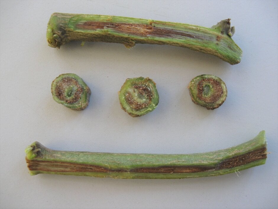 - Reddish discolouration of the , visible inside the stem as lines (if the stem is cut open lengthways) or dots (if it is cut across)