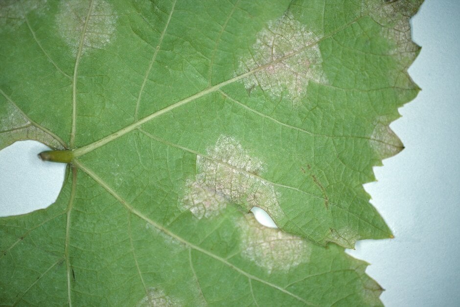 2. Powdery mildew on the leaves and fruit – caused by the fungal pathogen Erysiphe necator