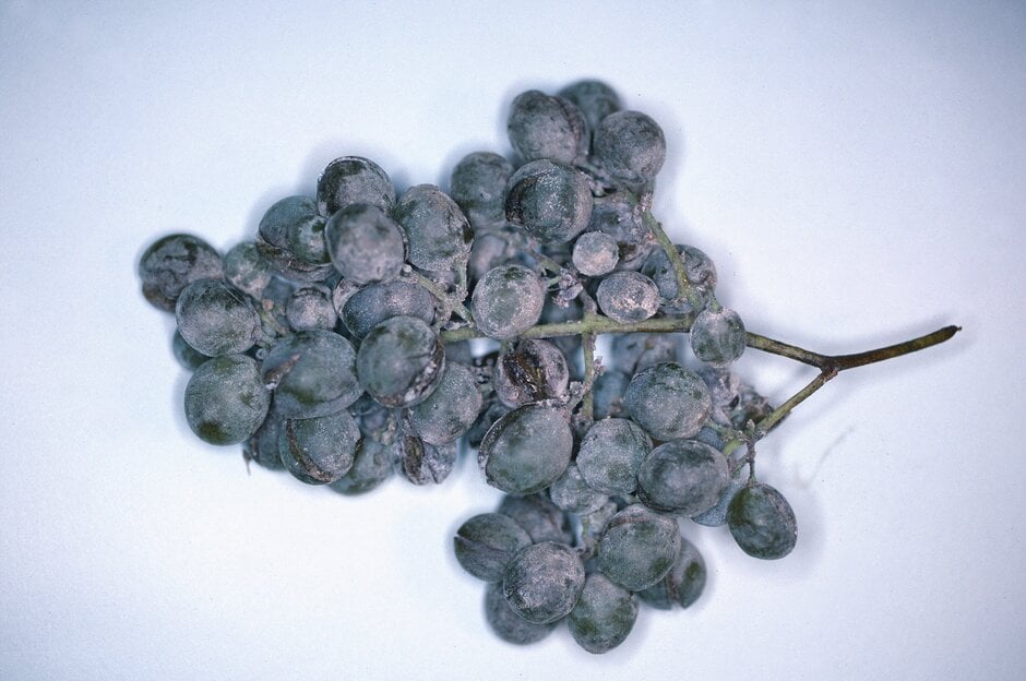 Grey mould: this pathogen produces abundant airborne spores on dead plant material, where it is able to grow as a saprophyte (feeding on dead organic material). It normally only infects plants through wounds, or particularly vulnerable organs (flowers or ripening fruit). When ripening grapes become infected they usually either fall prematurely or rot and then become mummified. When exactly the right climatic conditions occur, the so-called 'noble rot' develops, leading to fruit with a very concentrated sugar content which is used to make certain very desirable and expensive vintages; such conditions are, unfortunately, not likely to occur in the UK and are most unlikely in vines under glass.