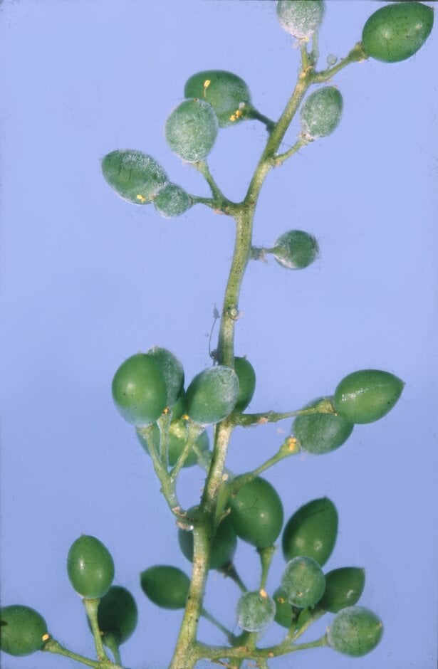• Fruits damaged by powdery mildew are often then infected by the grey mould pathogen and rot, or become mummified
