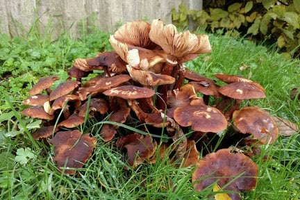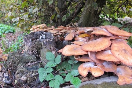Fungi have multiple structures. Mushrooms/toadstools are their fruiting bodies. These carry spores (the fungal equivalent of seeds). If you suspect a mushroom is honey fungus, inspecting its features and making a spore print will help you distinguish it from the many other orange-brown mushrooms that may grow in the garden but are harmless to living plants.