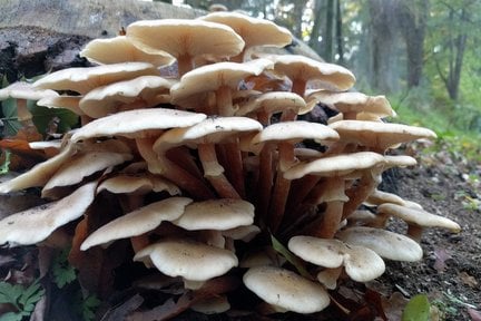 Spores – Spores develop and are released from between the gills. The colour of the spores may be hard to tell while still inside the mushroom cap, but by making a spore print (see below) you can observe the colour more easily. Honey fungus mushrooms produce pale (white/cream) spores.