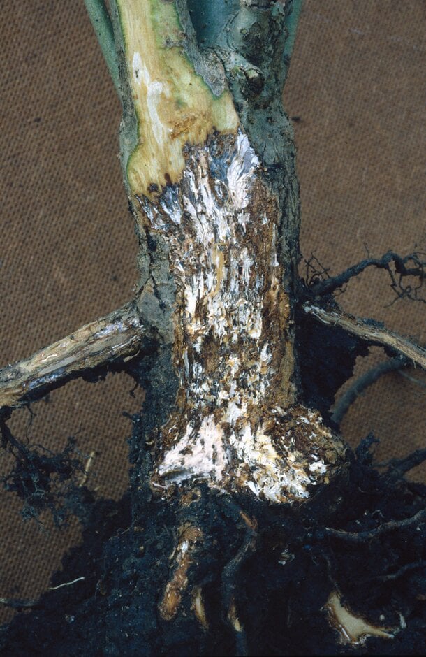 • Remove soil build up around the root collar (the base of the stem) of plants close to those showing signs of infection. Plants that are too deeply planted are more likely to be affected by the disease