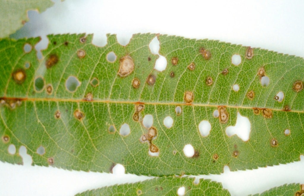 - The leaf spot pathogens Stigmina and Eupropolella cause brown spots on the leaves. The centres of the spots may eventually fall out, leaving irregular holes in the leaves that resemble damage from shotgun pellets – hence 'shot-hole'. Spots caused by Eupropolella are larger than those of Stigmina and sometimes have fungal fruiting bodies visible, and can lead to large parts of the leaf being shed