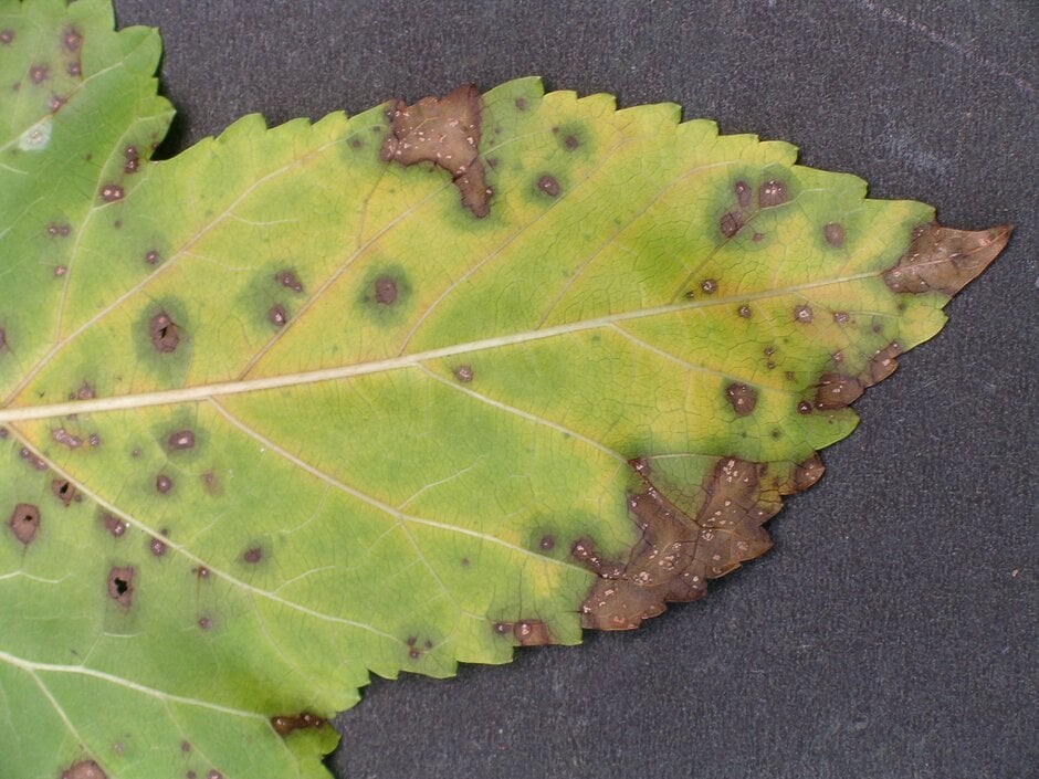 - Small, dark brown and irregular leaf spots with pale-green yellow haloes appear in the spring
