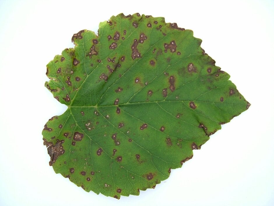 - Tiny, brown–black, spore-producing fruiting bodies (acervuli) occur on the lesions and defoliation can occur after severe attacks