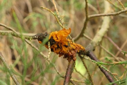 - On junipers Perennial swellings on stems and branches, producing orange, jelly-like outgrowths in spring following periods of high