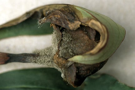 - On flowers: Infection often occurs just below the , which then hangs down and fails to open