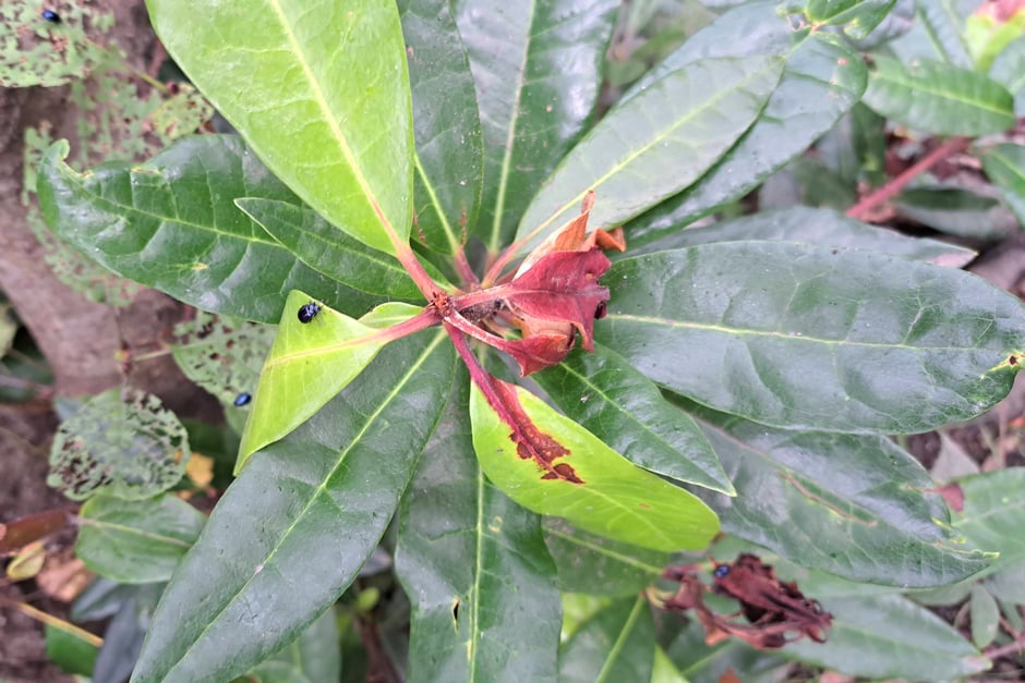 On shrubs such as Rhododendron, Camellia, Pieris and Kalmia: