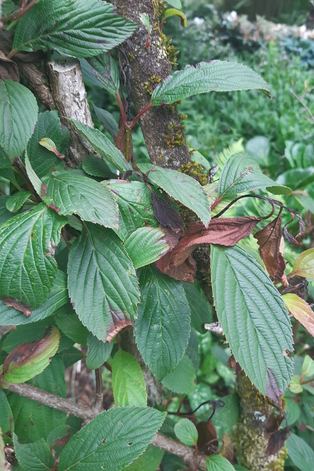 - Viburnum differs with infections occuring at the base of the stems that quickly cause wilting and collapse of the plant. Sometimes leaf blight symptoms are present as well