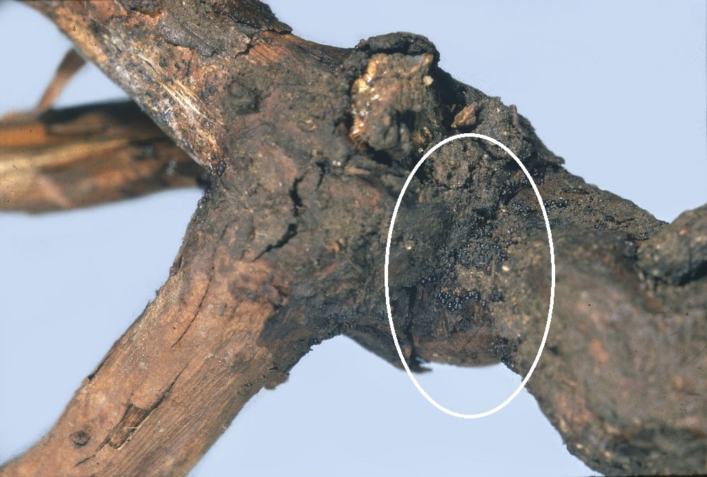 - The bases of the canes become dark brown, and the may split. Tissues below the bark are brown. The wood becomes very brittle so that the canes snap off easily at the base