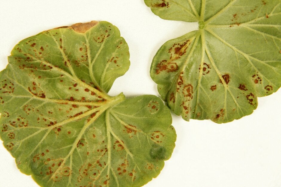 Most of the RHS Gardening Advice enquiries regarding rust occur on the following hosts: allium species, antirrhinum, bluebell, box, chrysanthemum, fuchsia, heuchera, hollyhock, hypericum, lawn grasses, mahonia, pear, pelargonium, poplar, rose and vinca.