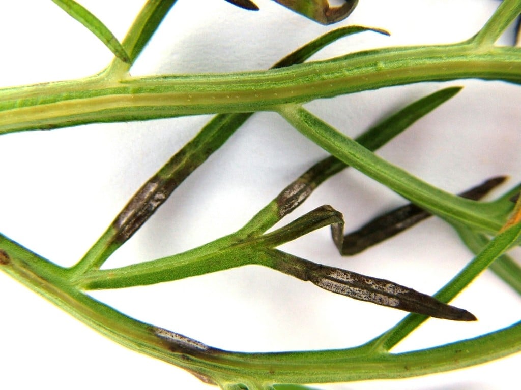 - Severely affected leaves of Calendula, Cosmos, Dahlia, Eschscholzia and Gaillardia may turn brown and shrivel