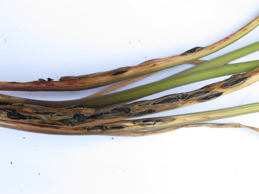 - Dark streaks or blisters develop on the affected plant parts