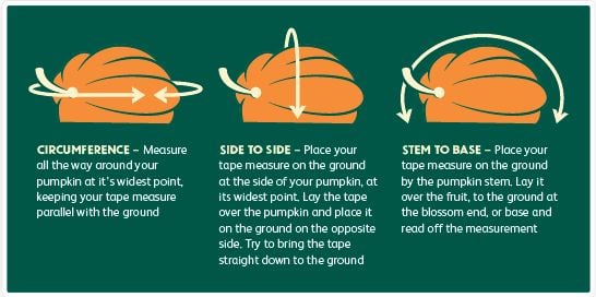 - Finally measure stem to base – start your measurement on the ground by the stem. Lay the tape over the pumpkin to the ground at the blossom end (indent in the base of the pumpkin)