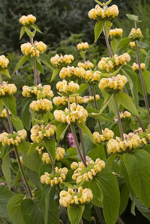 - Best for a Mediterranean garden: Phlomis fruticosa AGM is a popular choice with whorls of bright yellow flowers; Phlomis italica is a smaller shrub with soft pink flowers; Phlomis russeliana AGM is a tough perennial with rough, grey-green leaves and stout stems with tiers of yellow flowers.