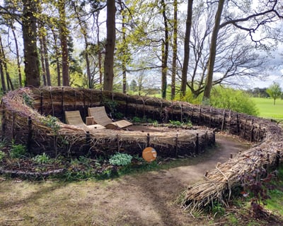 As you approach, drawn towards this strange spiral-shaped structure with its inviting entrance, you notice beautiful bands of colour created by the stems of dogwood, willow and birch used in its meticulous construction. When you spot a pair of inviting wooden recliners placed at the secluded centre, surrounded by tranquil planting and a small water feature, it is hard to resist going in to investigate.