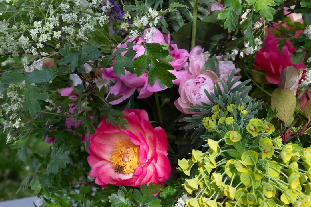 Lespedeza thunbergii AGM, Wisteria floribunda, Rodgersia podophylla and Camellia japonica are more of her favourites. They have in common a distinct structural quality – the arching stems of lespedeza, the long racemes of wisteria, the geometric flowers of a camellia. Woody plants hold their shape when inserted into the pins of a kenzan. The firmer a stem, the more useful it can be for creating the main holding structure of an arrangement. Though of course that’s not to say you can’t work with softer, more flowing plants such as spring and summer bulbs.