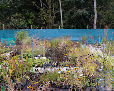 The nursery is surrounded by mature woodland. At its sunnier centre, an open space is packed with billowing grasses and an array of inspirational perennials. There’s no conspicuous evidence of the site’s aeronautical history. Stick a spade in the ground, though and it’s a different story: the whole nursery sits atop a bed of hardcore – the remnants of the old airfield. That’s why every single plant here grows in containers, from recyclable plastic pots to shiny, beer barrel-like drums salvaged from a bead manufacturer. An inconspicuous irrigation system makes the job of watering this sea of containers that much easier.