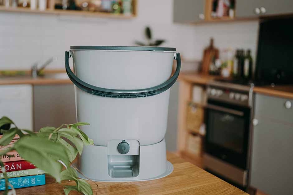 There are lots of bokashi kits you can buy and they generally all consist of two air-tight buckets with a drainer tray and a tap. There is usually also a supply of bokashi ‘bran’ with a scoop and a tool for pushing down the food waste to get rid of air pockets.