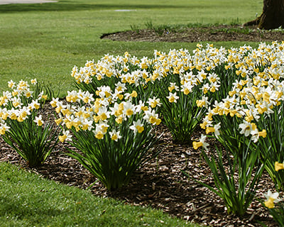 Narcissus ‘Weardale Perfection’ is a daffodil with an elegant bi–coloured, lemon–yellow trumpet and a creamy ivory perianth. It stands proud and tall on sturdy stems with larger, long–lasting flowers that can weather April winds.