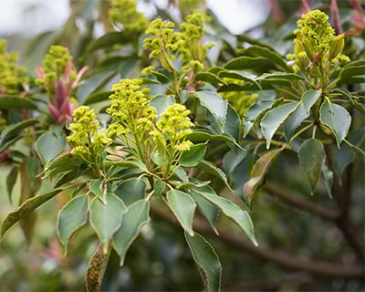Trochodendron aralioides (wheel tree) has a Greek-derived name: trochos means wheel and dendron means tree. This describes the yellow-green, small and round flowers with a crown of stamens that look like spokes. Its green, shiny, leathery leaves are almost 10cm long. Found in Taiwan and southern Japan, it survives temperatures as low as -30°c. It likes semi-shade but will grow in sun or shade. H6 x S4m.