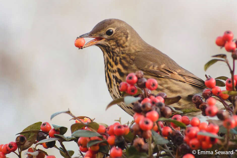 1. Plant berry-rich shrubs such as hawthorn (Crataegus monogyna), elder (Sambucus nigra), Berberis or Viburnum opulus. Now is a great time to plant these bare root. Crab apples or rowans may even attract waxwings – try pink-fruited S. vilmorinii or yellow-fruited S. ‘Joseph Rock’. Bullfinches are particularly keen on Viburnum opulus berries. Consider planting these in a mixed berry-rich hedge to increase the benefits and create a structural element in your bird-friendly garden. A mixed native hedge is one of the best features you can add to your garden to benefit a wide range of wildlife, providing food, habitat and shelter.
