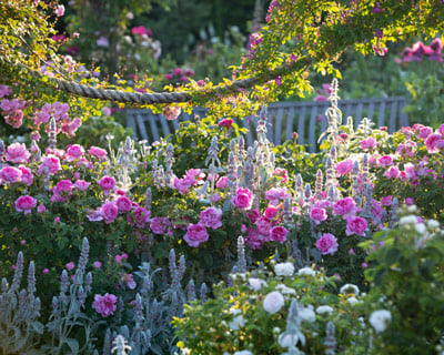 Six colour-coordinated beds burst with David Austin modern shrub roses in a rainbow of hues, from the warm salmon tones of Rosa LADY OF SHALOTT (‘Ausnyson’) AGM to the cooler shades of cream-flowered Rosa LICHFIELD ANGEL (‘Ausrelate’) AGM and pale lemon Rosa THE PILGRIM (‘Auswalker’) AGM. Their large flowers scent the air with delicious fragrance and the unspoiled glossy foliage adds to their beauty. English climbing roses scale up obelisks on the corners of each bed, while wonderfully scented and bushier Pemberton Roses fill three further beds.