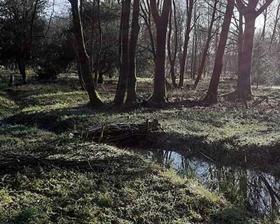 The water is slowed down at regular intervals by leaky dams. These are structures created using larger logs and tree trunks set into the ground, and smaller sticks and brash built up around them. These partially slow water but also act as filtration of the sediments in the water as they flow through. The system has no pond lining; the base of the ditches and scrapes are boggy most of the time and become wet during heavy rainfall.