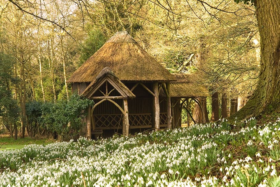 The gardens feature the Italianate Garden with a koi carp pond, the Grade II* listed Fernery designed by Matthew Digby Wyatt, and the unusual puddingstone Grotto. The 190-acre grounds include the flint-walled Skating Pond, now a labyrinth and the Herb Garden with Beech Houses. The southern arboretum, full of naturalised snowdrops, daffodils, and bluebells, leads to the thatched woodland Arbour, inspired by Repton’s drawings. Designed to thrive in a changing climate, the Lazell Garden and Dry Garden showcase sustainable landscaping amidst the historic beauty of Ashridge House Gardens.