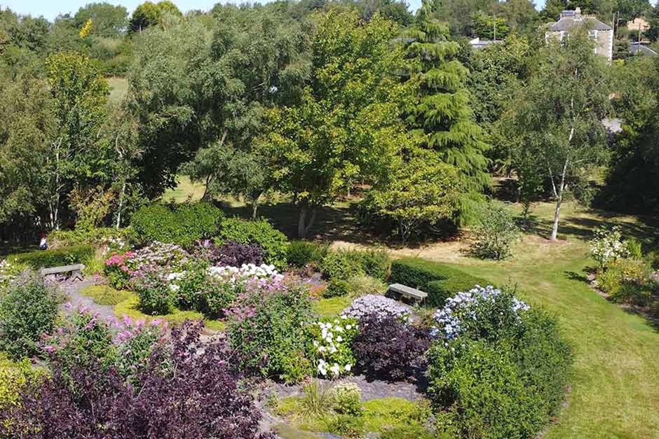 Visitors can explore a formal garden near the house, complete with a tea terrace; a cottage garden featuring a natural puddled clay pond; and a woodland area showcasing a small collection of interesting trees, such as Sorbus, Malus, and Prunus. The No-Dig border features an array of bulbs, hardy geraniums, and paeonies.