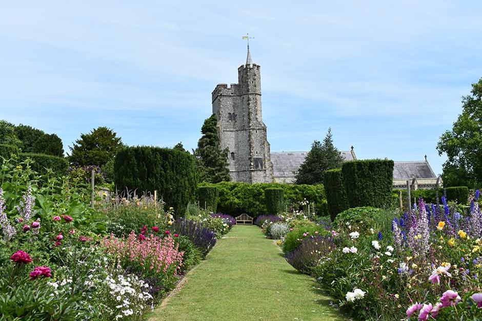 The nearby woodland garden showcases many plants that thrive in acidic conditions. One of the garden’s most notable features is the walled garden, which consists of three walled enclosures connected by a central lawn, with views of the village’s 12th-century church. A holly walk and a second tree-lined avenue run parallel to the walled garden, while a second arboretum lies to the west.