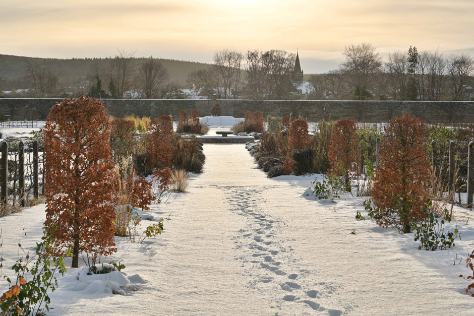 There are over 200 wall-trained fruit trees, including the historic Gordon Castle plum and another 400 step-over and espaliered trees, along with a recently planted cherry orchard and 82 different apple varieties. A soft fruit garden showcases the many different berries that Scotland is famous for, and a grass maze creates an interesting walk to a pear sculpture at the centre. With a wonderful natural play area and seasonal garden trails, there is plenty for children to see and enjoy as well.