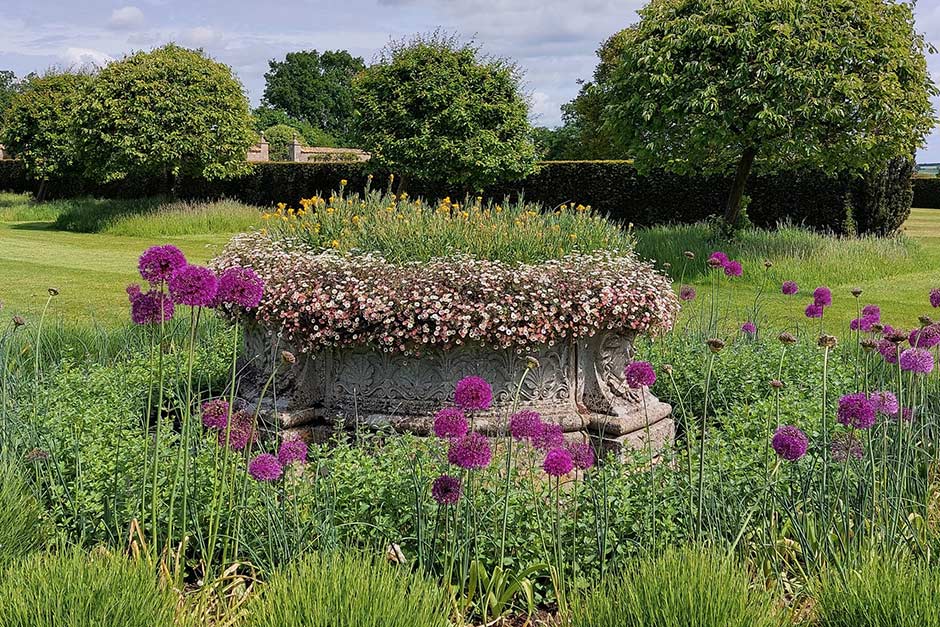 Formal gardens were established in the 17th century, and it is in this style that they largely remain today. The west lawn provides uninterrupted views of the Capability Brown-designed landscape, while the south lawns offer fabulous views of the earlier Tudor-style building adorned with wisteria, Magnolia grandiflora and clematis. Flanking a large vista extending south are two yew squares topped with meticulously trimmed topiary. These are complemented by a backdrop of semi-woodland, bursting with spring colour from narcissi, primulas and bluebells.