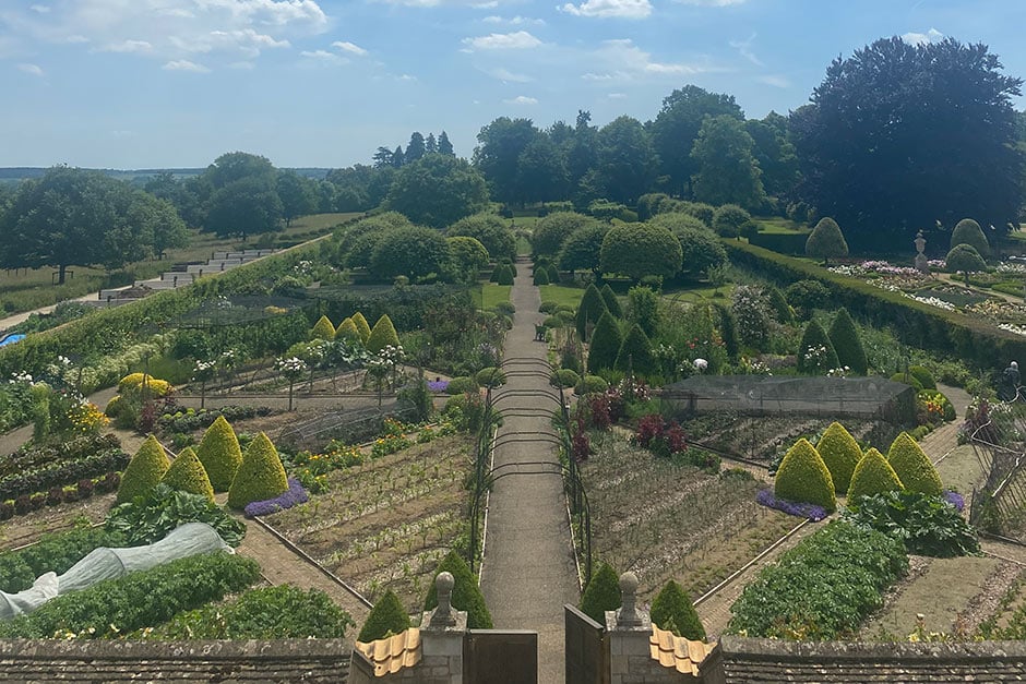 The ornamental kitchen garden is an early example of a formal potager. Trimmed box hedges, mature quince, medlar trees, espaliered apples and pears add interest.