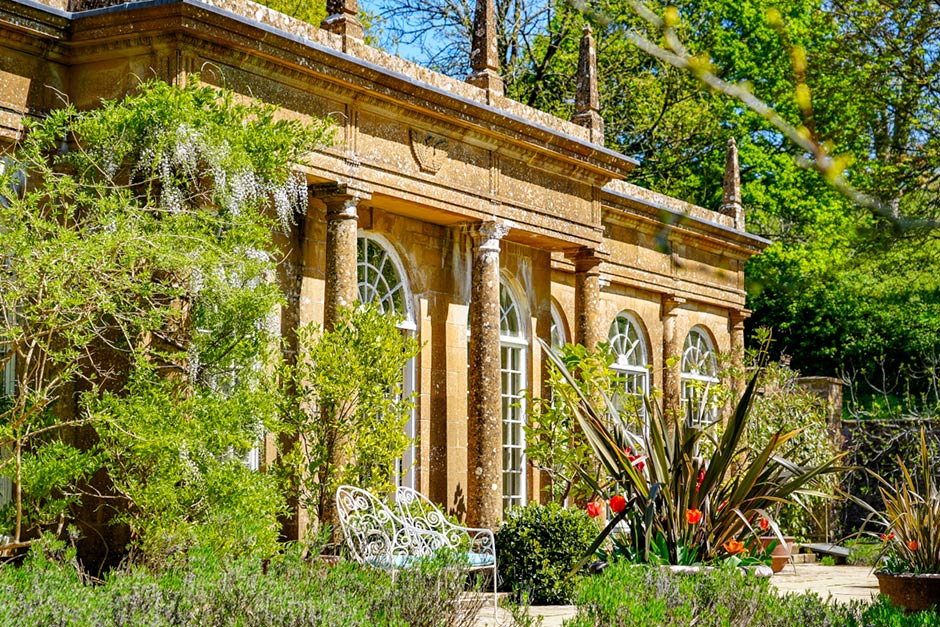 The garden evolved further under Victor Montagu in the 1960s with the addition of a gilded orangery, its glass roof sheltering roses, begonias and exotic plants, while offering sweeping views across the valley. From the courtyard entrance to the croquet lawn framed by clematis, hydrangeas and hellebores, the garden gradually unfurls, revealing a spectacular descent into the valley below.