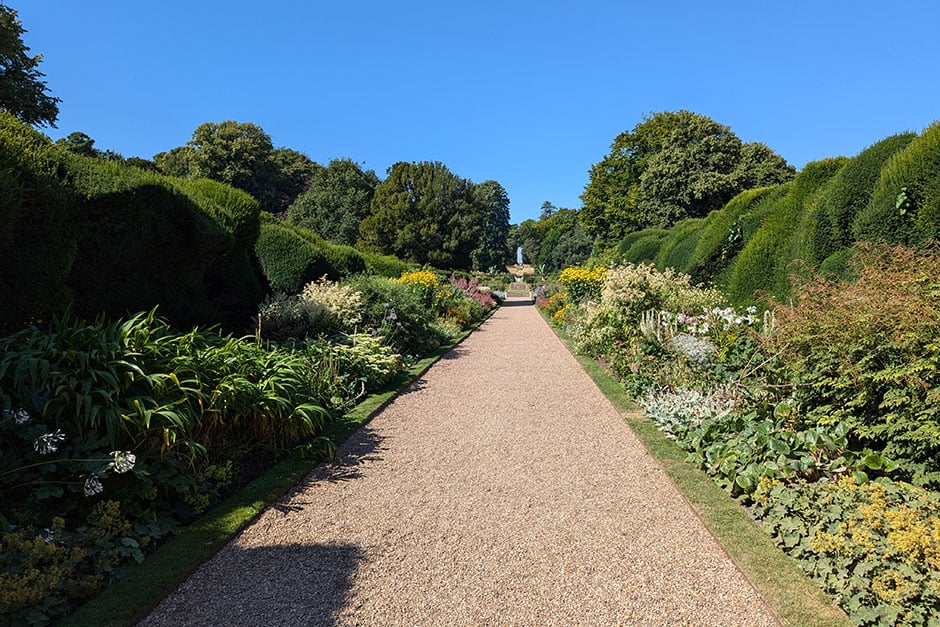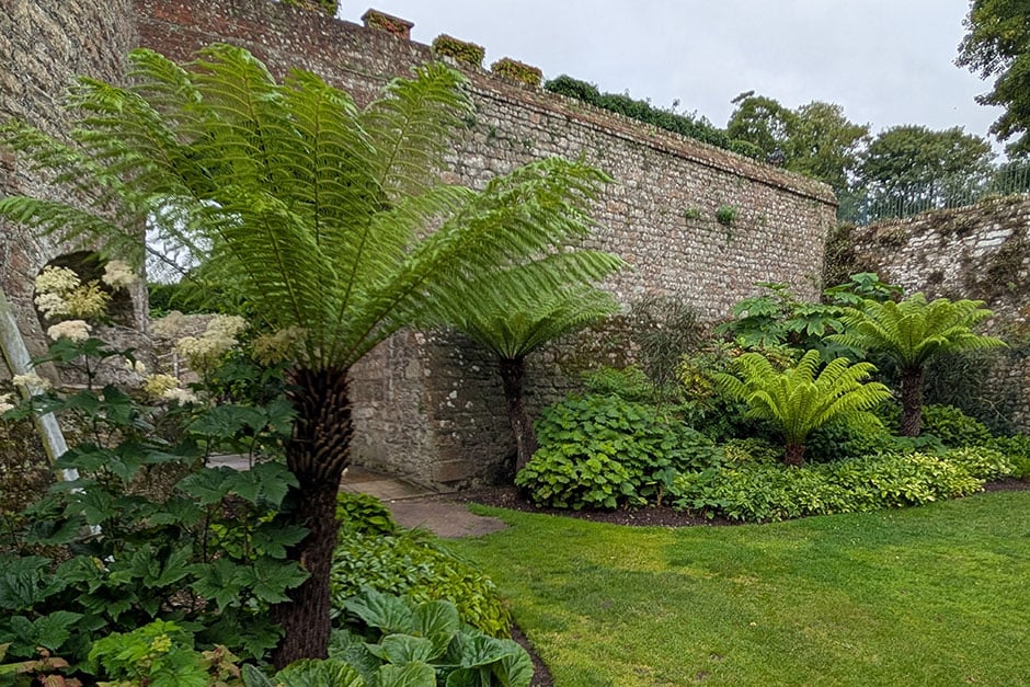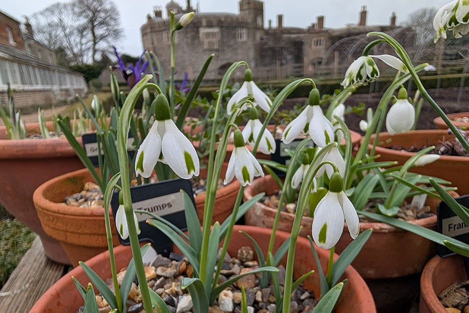 Key features include an 85-metre herbaceous border backed by a striking yew cloud hedge, a productive kitchen garden, and the Queen Mother’s Garden, created by Penelope Hobhouse for her 95th birthday. The dry moat showcases exotic, jungle-style planting with unusual woody species such as Brassaiopsis, tree dahlias, Schefflera and Tetrapanax cultivars. Woodland walks and meadows offer seasonal highlights from snowdrops and bluebells to native orchids, while the shingle beach supports rare coastal plants and moths. Walmer also holds National Plant Collections for Greatorex double snowdrops and Tetrapanax, and in 2024 received the European Garden Award, affirming its status as one of Britain’s most distinctive gardens.