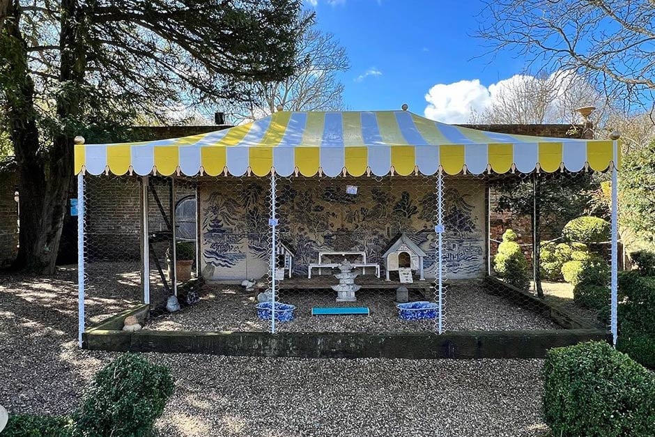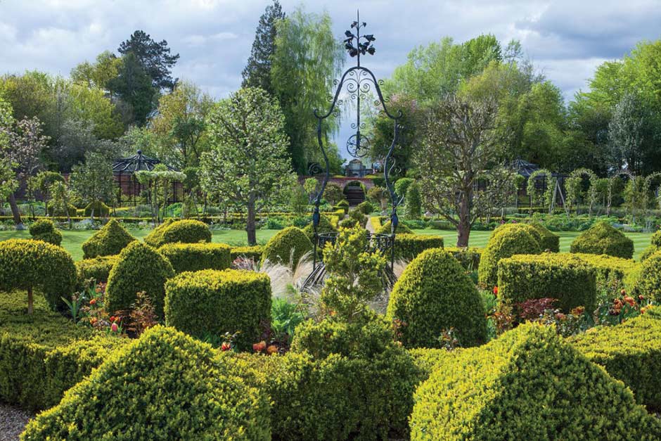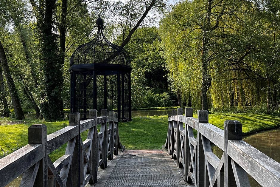 The Five Bridges Garden dazzles in spring with 100m of delft blue hyacinths, while the Walled Garden features thousands of tulips. Old roses climb formal gardens and Hampshire walls, with species hydrangeas surrounding a chinoiserie pavilion housing small Pekin chickens. Peony-adorned topiaries frame the wellhead, and a checkerboard garden showcases bold pots and new agapanthus. Two oriental pergolas, framed by maples and peonies, add to the beauty, while fruit cages centre two potagers in the largest Walled Garden, with herbaceous borders in the other half. Spanning 10 acres, the garden offers a peaceful 40-minute stroll, with exhibition glasshouses, a tearoom, and an entry shop.