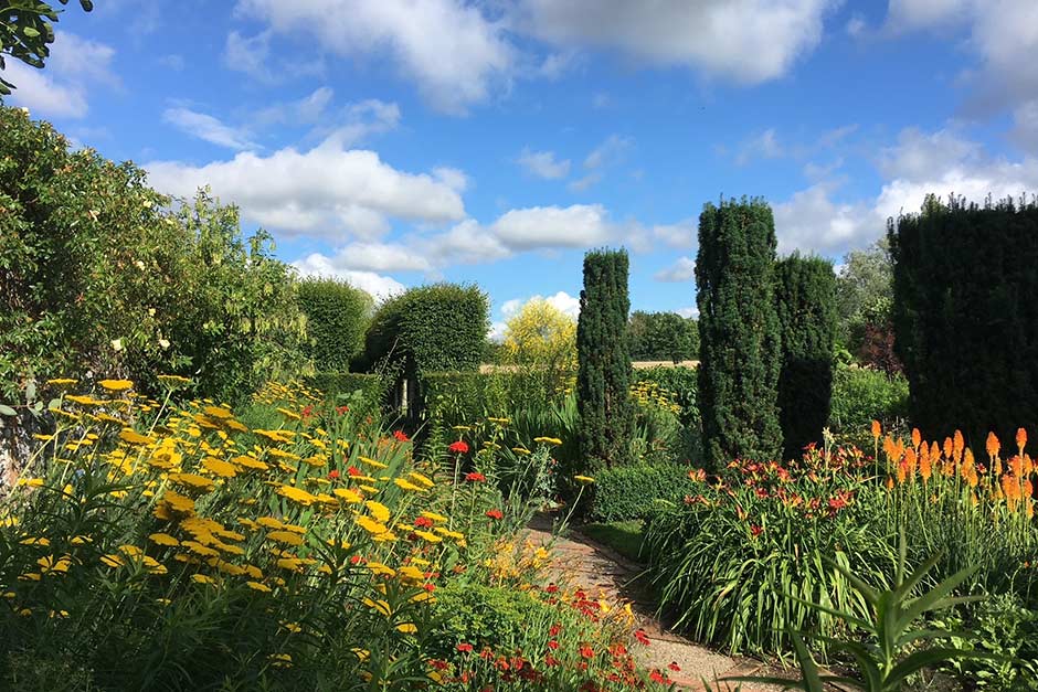 The garden at Wyken is ingeniously designed as a series of old-style gardens to complement the Elizabethan house. These include a knot garden, herb garden, traditional English kitchen garden, wildflower meadows, nuttery and a copper beech maze. All are in scale with the house and the farmland around. Stylish and well maintained, this is one of the best modern private gardens in the country. The restaurant features in the Good Food Guide. The ‘Giant Stride’ (a sort of revolving maypole) was added to commemorate the millennium.