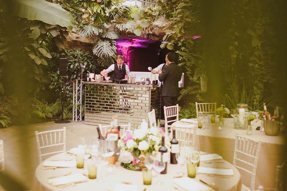The spectacular Glasshouse offers the perfect setting for your wedding reception among the exotic plants and waterfalls. A truly unique experience