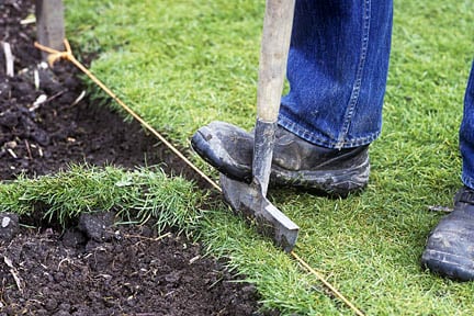 Gardeners sometimes need to lift turf themselves using a spade or ‘turfing iron’ and then trim each turf to a regular size and depth. To do this, place the turf upside down in a prepared wooden box and slice off soil at the correct depth. The thinner the turf is (within reason) the better the rooting; a 2cm (¾in) turf roots better than a 7.5cm (3in) turf. Avoid turf that contains a lot of weed.