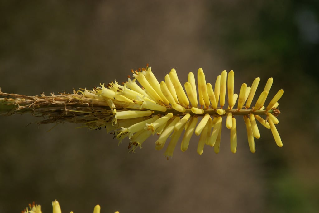 Kniphofia may be evergreen or herbaceous perennials, with linear or strap-shaped leaves and erect stems bearing a dense raceme of tubular, usually pendent flowers