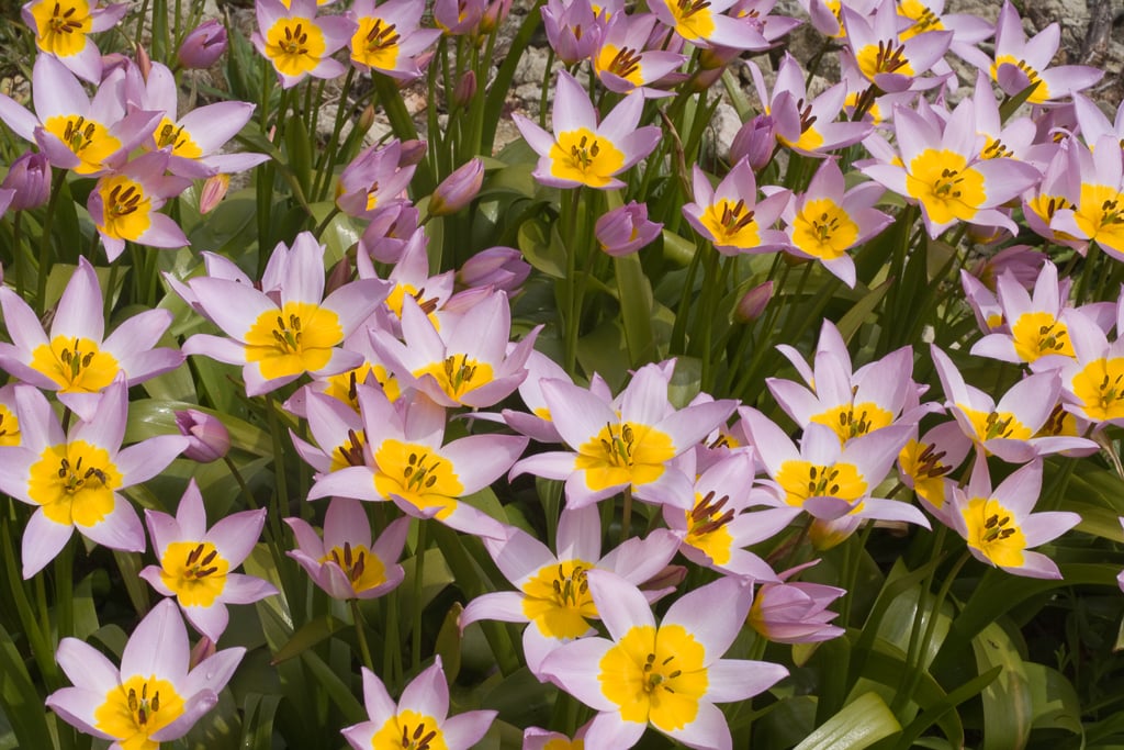 A perennial bulb with long, linear, glossy green leaves. Flowers are star-shaped and fragrant, pink to lilac purple and with yellow haloes rimmed with white at the base. Flowers are produced singly or sometimes in clusters of up to 4 in mid to late spring, and stand to about 35cm high
