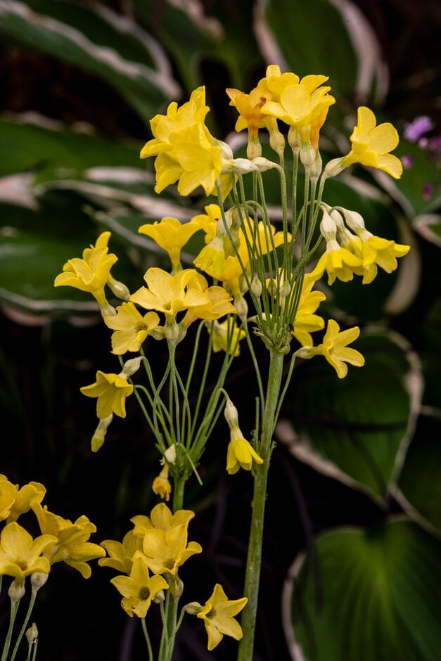 - Sikkimensis section primulas are herbaceous perennials with long-stalked, oblong or oval leaves in a basal rosette, and erect stems bearing terminal umbels of nodding, fragrant, funnel-shaped flowers in summer