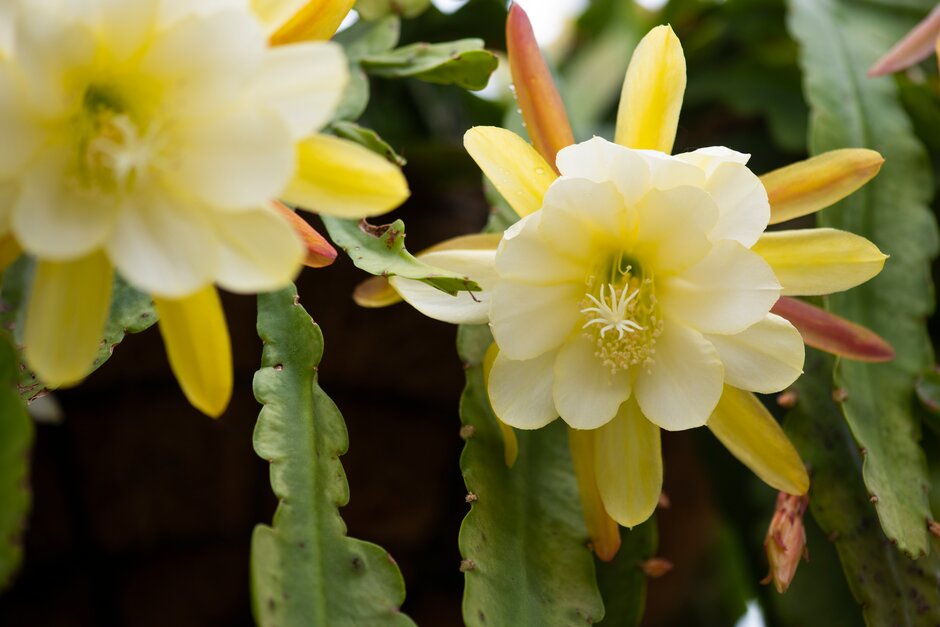 Epiphyllum are a genus of around 20 species of epiphytic cacti. Their rounded stems produce succulent leaf-like branches with funnel-shaped nocturnal flowers.