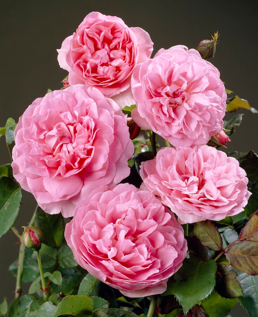 A bushy, spreading, free-flowering shrub rose, about 1.2m tall, with prickly stems bearing large mid-green leaves. Small clusters of strongly fragrant, fully double, cupped, pale rose-pink rosette blooms 7cm across, crowded with petals, paler at the edges, with an occasional button eye, repeat-flowering well, through summer and sporadically in autumn