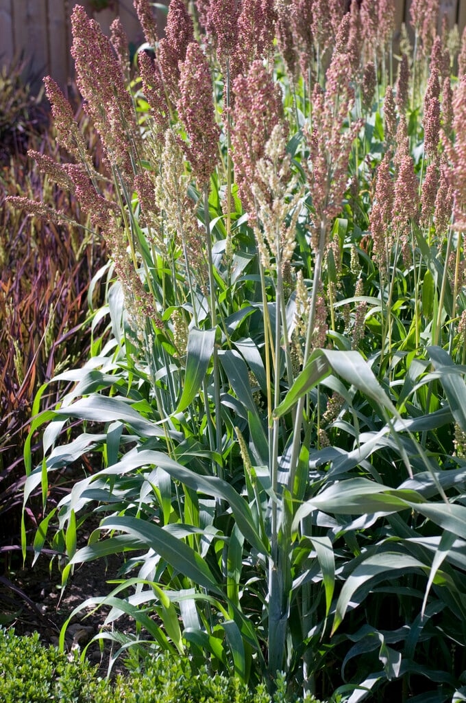 A tall, upright, annual plant with green, strappy leaves. Flower spikes are covered in small greenish-brown flowers, ageing to dark brown. Can be grown in the UK as a bedding plant, providing height and structure in bedding displays